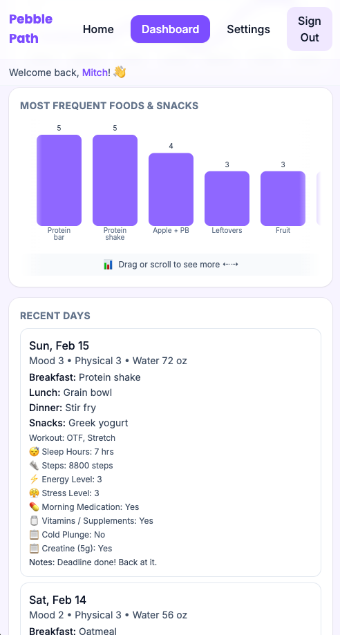 Dashboard surfaces patterns across days and weeks — no spreadsheet required.