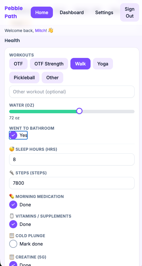Daily check-in: mood, water, meals, workouts, notes. Two minutes, maybe.